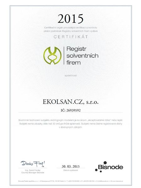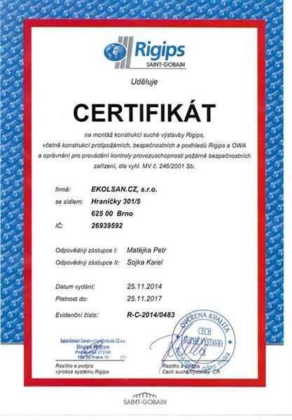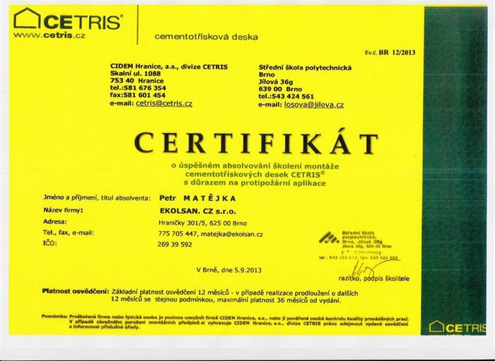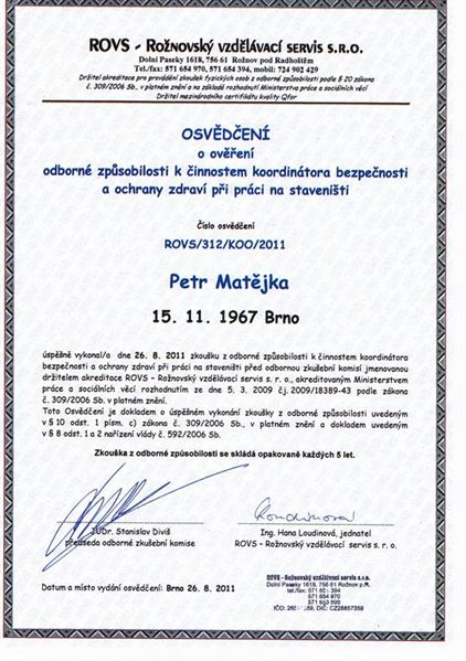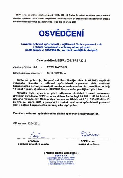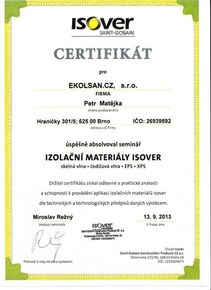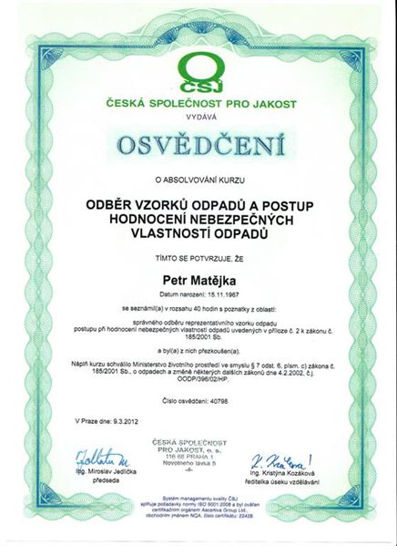 Certifikáty a osvědčení Ekolsan s.r.o, Petr Matějka